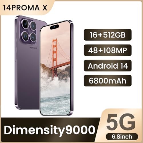 14PROMA X Unlocked Cell Phone,Long Battery Life 6.82″ HD Screen Unlocked Phones,16+512GB Android 14 Smartphone with 128G Memory Card, Dual SIM/Fingerprint Lock/Face ID/GPS (Purple, 16+512G)