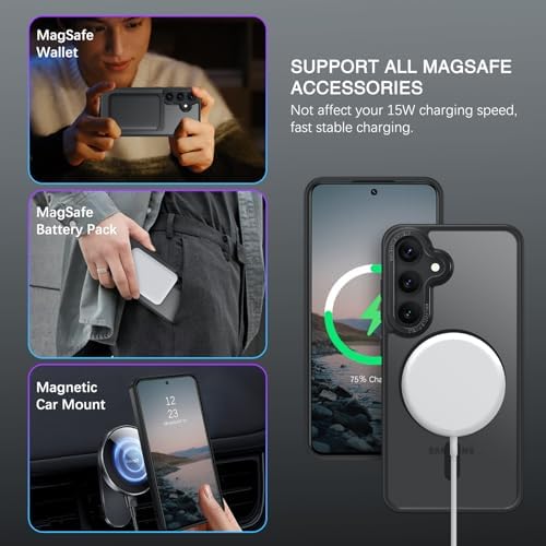 ??Compatible with MagSafe Accessories? This Samsung Galaxy S24 Plus Phone Case, with a built-in magnetic ring that aligns perfectly with MagSafe chargers and other Qi-certified chargers, offers a strong attach experience and faster wireless charging. This Samsung Galaxy S24 Plus Case can be firmly attached to all MagSafe accessories like MagSafe charger, wallet, battery pack, car mount. However, it can’t stick to metal surfaces like fridges, steel, etc.