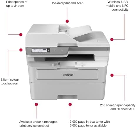 From the brand Discover new in Brother offers Printers with cashback COMPACT, PROFESSIONAL PRINTING: Business printing for less with fast print speeds, 256MB internal memory and 8.8cm colour LCD touchscreen and NFC secure authenticationNETWORK CONNECTIVITY: Perfect for the home or small business with print from PC or Brother Mobile Connect