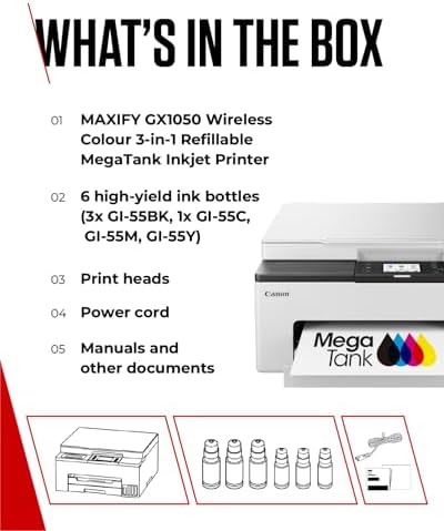 Canon MAXIFY GX1050 Wireless Colour 3-in-1 Refillable MegaTank Inkjet Printer – A4 Print, Copy, Scan – Wi-Fi, Cloud Link, Ethernet Connectivity – Home Office Printer, Includes 6 x Ink Bottles
