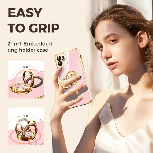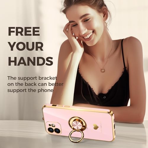 Compatible for iPhone 12 Case with 2 Pack Screen Protector, 360° Rotatable Ring Holder [Luxury Hearts Pattern] Plating Gold Edge Slim Soft Phone Cover Case for iPhone 12 – Girl Pink