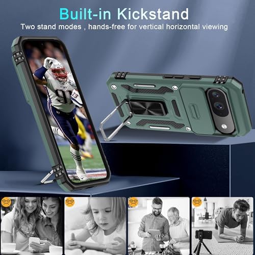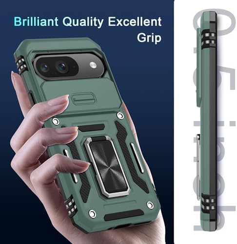 DEERLAMN for Pixel 9 Case, Google Pixel 9 Pro Case with Slide Camera Cover+Screen Protector(1 Pack), Rotated Ring Kickstand Military Grade Shockproof Protective Cover- Green