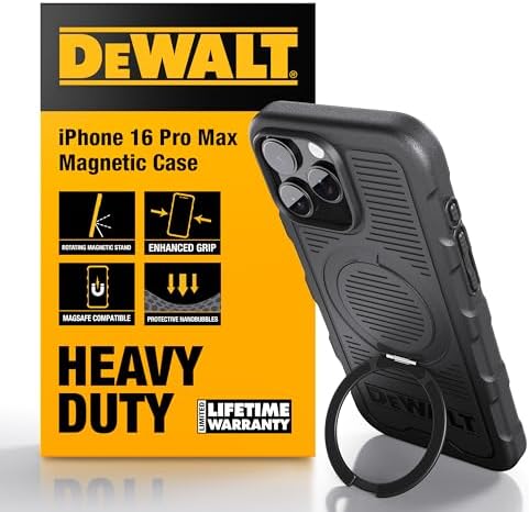 DEWALT 360° Rotatable Magnetic Ring Case for iPhone 16 Pro Max, Heavy Duty Drop Protection, MagSafe w/Stand & Ring Holder, Shockproof Nanobubbles