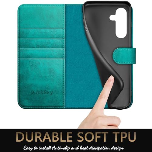DuckSky for Samsung Galaxy S23 FE Genuine Leather Wallet case ?RFID Blocking??4 Credit Card Holder??Real Leather? Flip Folio Book Phone case Protective Cover Women Men for S23FE case Blue Green