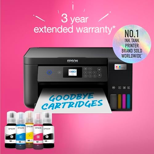 Epson EcoTank ET-2851 A4 Multifunction Air Print and Wi-Fi Ink Tank Printer with double sided printing, Up To 3 Years Of Ink Included SAY GOODBYE TO CARTRIDGES – EcoTank provides hassle-free home printing – the ultra-high capacity ink tanks allow mess-free refills and the key-lock bottles are designed so only