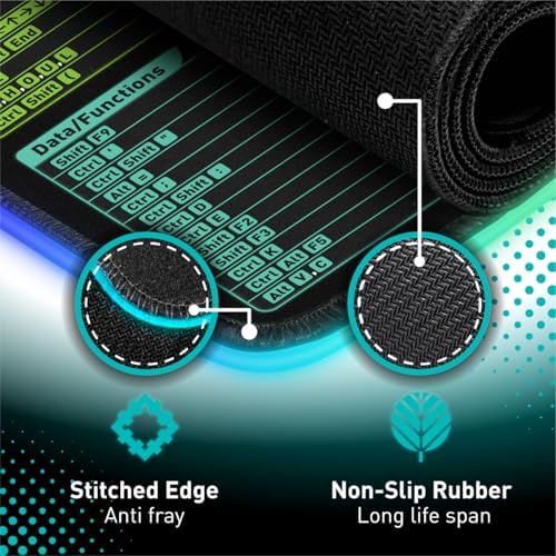 Excel Shortcut Keys LED Mouse Pad – Colorful RGB Luminous Extended Large Cheat Sheet Gaming Mousepad| PC Office Spreadsheet Keyboard Mat| Non-Slip Stitched Edge