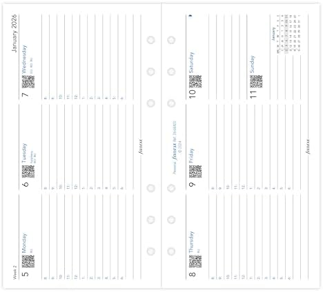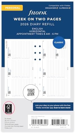 This Filofax Personal 2026 diary refill 26-68420 features a QR code on every day which, when used together with the Filofax Reminder App, allows you to plan on paper and review on your phone. Simply download the free Filofax Reminder app and scan the QR code on the date of your choice. This will allow you to not only copy appointments from your diary onto the App, but also set up reminders. The appointments can also be synced with your phone’s calendar. This innovation will allow you to always have the important contents of your diary with you. This Filofax Personal 2026 diary is a week on two pages horizontal format in English, with the week to view starting on a Monday. Appointment times from 08:00 to 18:00. January to December 2026. White paper. Paper size 95mm x 171mm, drilled with six round holes. Made in the UK.