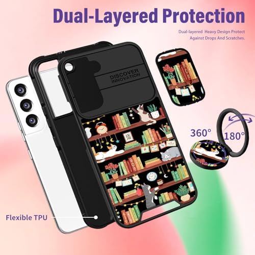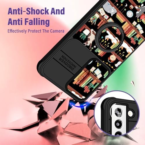 for Samsung Galaxy S21 FE 5G Case – Women Girls Cute Phone Cover Cat Kawaii Girly Bookshelf Cartoon Design with Camera Cover Ring Stand Teens Funda for Samsung S21FE Cases 6.4”