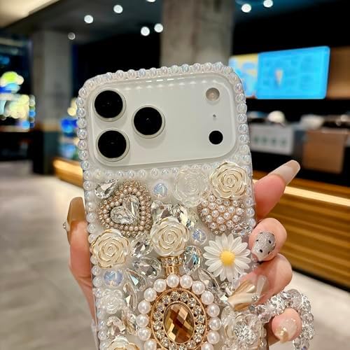 iFiLOVE for iPhone 17 Pro Max Bling Diamond Case with Flower Strap, 3D Luxury Sparkle Glitter Crystal Rhinestone Pearl Love Rose Wristband Bracelet Case Cover for Girls Women Kids (Champagne)