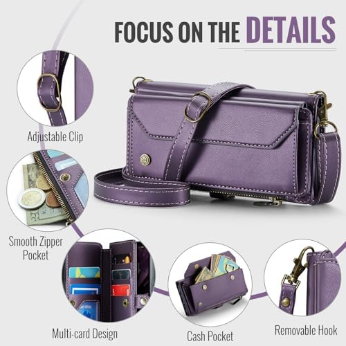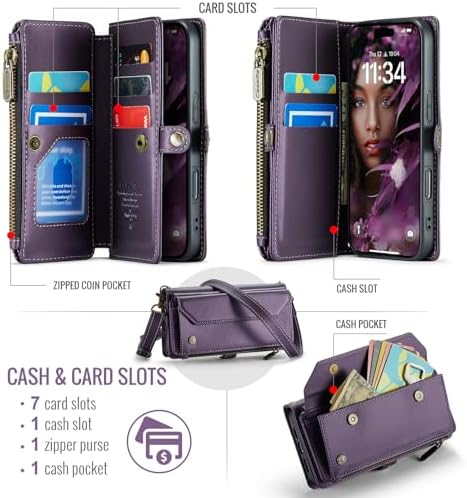 Leather Purse Bag Case for iPhone 17, Magnetic Flip Wallet Cover with Kickstand RFID Blocking Card Holders Cash Slot Zipper Pocket Crossbody Lanyard Wrist Strap (Purple)