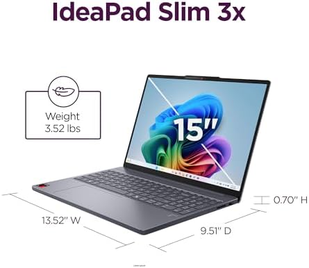 Smarter computing meets bold design and durability with the IdeaPad Slim 3x, your AI-powered Copilot+ PC. Its Snapdragon® X processor combines reliable computing experiences with solid performance, an efficient GPU, and the leading NPU delivering 45 TOPS for advanced AI processing. Ideal for creating presentations, web browsing, connecting on the go, or enjoying streaming content, this chip offers balanced performance and built in intelligence allowing you to find your flow with its ultra-portable design and great battery life. Intelligent computing meets brilliant graphics owith the expansive 15″ WUXGA display with near borderless design. The 16:10 screen adds space for your artistic vision, and TÜV certification keeps your eyes comfortable all day. Its premium features are encased in a dependable metal chassis that’s certified military-grade durable against everyday bumps and tough travel conditions. Future-proof your tech with the IdeaPad Slim 3x. Its ready-to-expand SSD slot lets you DIY more space for files, apps, or games whenever you need it. Stay ready for whatever, wherever at the top of your game.