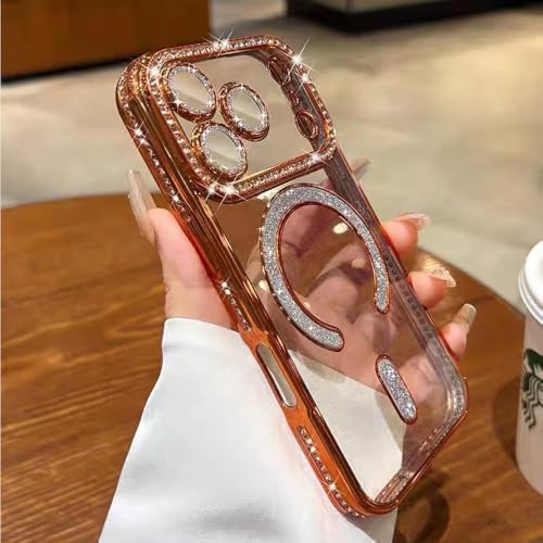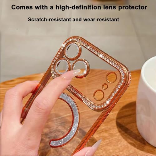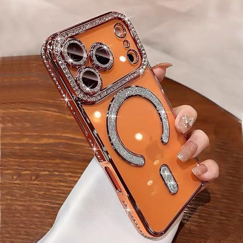 Magnetic Case for iPhone 17 Pro Max 6.9″[Compatible with MagSafe] with Sparkle Diamond Camera Protection Shockproof Clear Cute Glitter Bling Phone Case for iPhone 17 ProMax,Orange