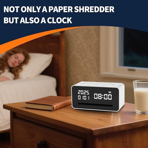 ?Clock Design Compact Paper Shredder for Home?The clock-shaped paper shredder not only functions as a paper shredder but also serves as a clock. With dimensions of just 17.5×7.8×8.7cm, it is compact and space-saving, easily fitting into a drawer.Takes up barely any room on your desk, counter, or table.