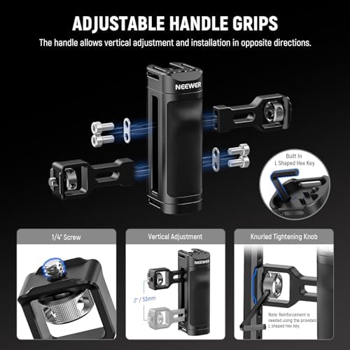 Ergonomically shaped handles: Two side handles feature contoured silicone handles for comfort and safety. They can be connected to the cage with thumbscrews in vertical or horizontal direction. With the L-shaped Allen key, you can tighten the handles or adjust them up and down