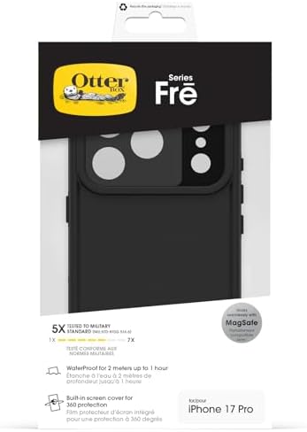 OtterBox Fr? Series MagSafe Case for iPhone 17 Pro, Waterproof (IP68), Shockproof, Dirtproof, Protective Case with built in Screen Protector, x5 Tested to Military Standard, Black