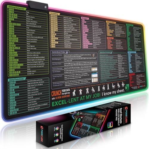 • Excel Shortcut Keys LED Mouse Pad – Colorful RGB Luminous Extended Large Cheat Sheet Gaming Mousepad| PC Office Spreadsheet Keyboard Mat| Non-Slip Stitched Edge