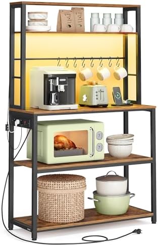 • VASAGLE Coffee Bar with LED Lights, Kitchen Bakers Rack with Power Outlet, Microwave Stand with Adjustable Shelves, 8 Hooks, 40 x 80 x 168.4 cm, Rustic Brown and Matte Black KKS050KD02