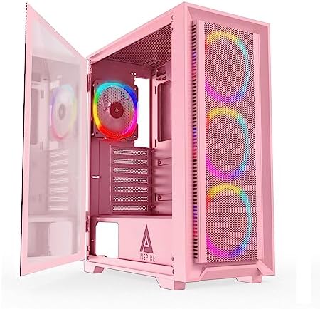 • Apevia Inspire-PK Inspire Mid Tower ATX Gaming PC Case w/ 4X 120mm ARGB Fans, 366 RGB Light Modes, 1x Metal Mesh Airflow Front Panel, 1x Door Swivel Style Magnetic Glass Side Panel, 2X USB3.0, Pink