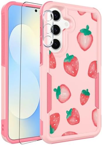 • for Samsung Galaxy S25 FE Case with Screen Protector + Camera Lens Protector: Cute Flower Floral Fruit Design for Girls Women Slim TPU Bumper Silicone Cell Phone Cover (Strawberry)