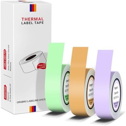 • ORGBRO X1 Label Maker Tape, Genuine Thermal Label Print Paper 0.59″×275.6″(15mm×7m), Standard Laminated Office Labeling Tape Replacement, 3-Roll, Green/Purple/Orange