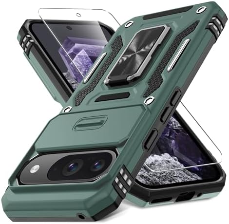 • DEERLAMN for Pixel 9 Case, Google Pixel 9 Pro Case with Slide Camera Cover+Screen Protector(1 Pack), Rotated Ring Kickstand Military Grade Shockproof Protective Cover- Green