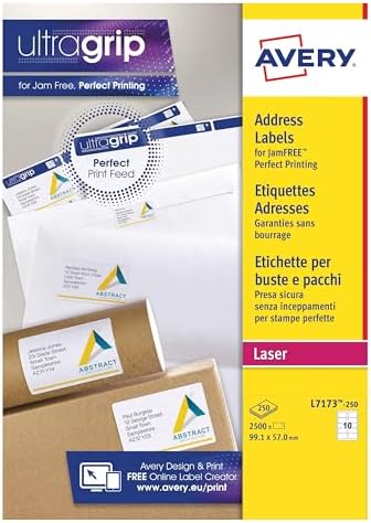 • Avery Printable, Customisable Address Mailing Labels, Laser Printers, 10 per A4 Sheet, 2500 Labels, QuickPEEL (L7173), White Blank Printer Sticker Sheet.
