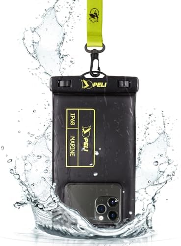• Peli Marine – IP68 Waterproof Phone Pouch (Regular Size)-Floating Waterproof Phone Case For iPhone 16 Pro Max/iPhone 15 Pro/14 Pro/13/12/S25 – Detachable Lanyard – Black/Hi-Vis Yellow
