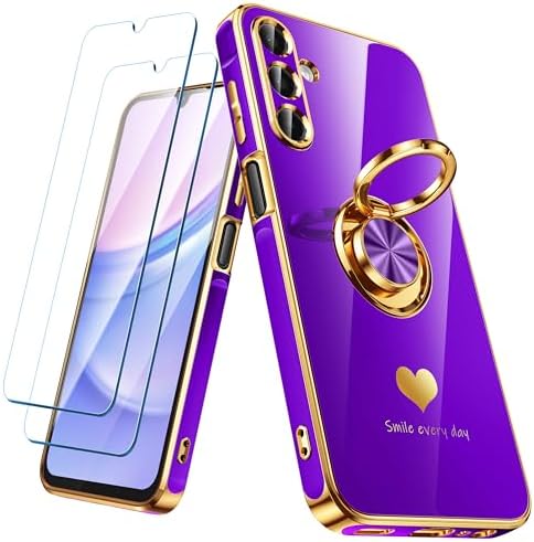• for Samsung Galaxy A15 5G Case with 2 Pack Screen Protector, 360° Rotatable Ring Holder [Luxury Hearts Pattern] Plating Gold Edge Slim Soft Phone Cover Case for Galaxy A15 – Neon Purple