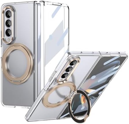 • Smartphone Flip Cases Compatible with Samsung Galaxy Z Fold 3 Case with Screen Protector, 360°Rotatable Ring Kickstand, Military Grade Shockproof Translucent Protective Case, Crystal Clear(Golden)