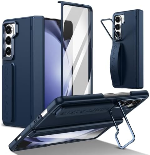 • Smartphone Flip Cases Wristband Compatible with Samsung Galaxy Z Fold 5 Case with Screen Protector, Hidden Kickstand & Silicone Wrist Strap, Rugged Shockproof Hinge Protection Flip Cover(Blue)