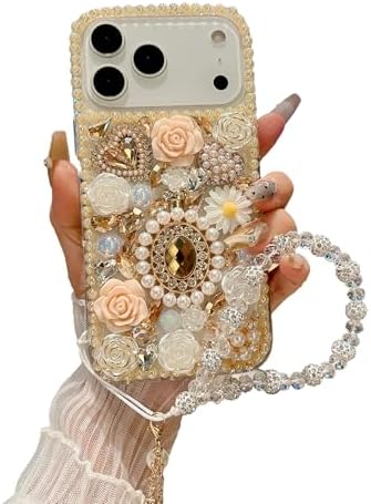 • iFiLOVE for iPhone 17 Pro Max Bling Diamond Case with Flower Strap, 3D Luxury Sparkle Glitter Crystal Rhinestone Pearl Love Rose Wristband Bracelet Case Cover for Girls Women Kids (Champagne)