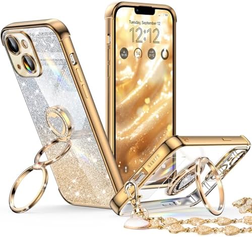 • XYZ for iPhone 13 Mini Case with Stand, Phone Case with Double Ring Kickstand, Women Girls Bling Luxury Glitter Clear Phone Case Cover Heart for iPhone 13 Mini, Gold