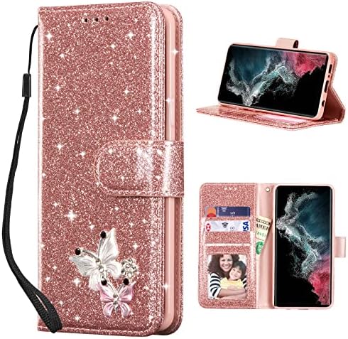 • UEEBAI Wallet Case for Samsung Galaxy S21 Ultra 5G, Premium Sparkly Glitter PU Leather Phone Case Card Slots Kickstand Case Magnetic Closure Bling Case Shiny Flip Cover with Wrist Strap – Rose Gold