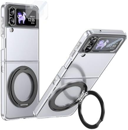• Smartphone Flip Cases Compatible with Samsung Galaxy Z Flip 4 Case with Screen Protector, 360°Rotatable Ring Kickstand, Military Grade Shockproof Translucent Protective Case, Crystal Clear(Black)
