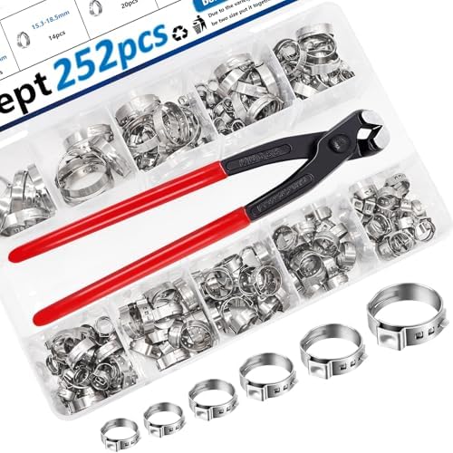 Price: (as of – Details) 252Pcs 14-Sizes 304 Stainless Steel Single Ear Hose Clamps with Ear clamp plier 5.3-33.1mm Crimp Hose Clamps Assortment Kit for Auto/Home Appliance/Pipe/Fuel Line Stepless hose [More]