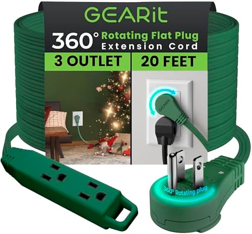 • GEARit 360 Degree Rotating Flat Power Strip Extension Cord with 3 Outputs (20ft, Green) 16AWG/13A 3 Pin Cable, Energy Saving Extension Cord for Home, Office, Bedroom, Essential Piece