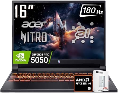 • acer Nitro V 16 AI Gaming Laptop, 16″ WUXGA IPS180Hz Display, AMD Ryzen 5 240, NVIDIA GeForce RTX 5050 8GB GDDR7 Graphics,16GB DDR5, 512GB Gen4 SSD, WiFi 6E, RGB Backlit KB, Win11 Home, W/256GB PSD