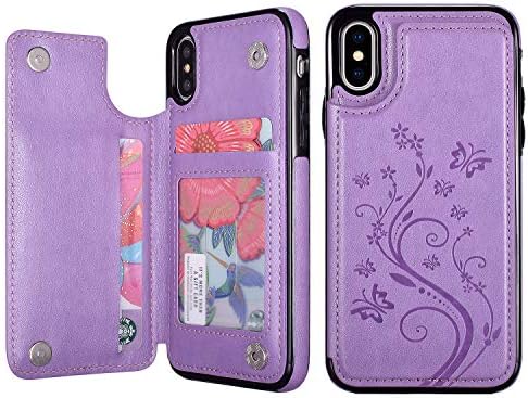 • UEEBAI Case for iPhone XR, Luxury PU Leather Case [Two Magnetic Clasp] [Card Slots] Stand Function Butterfly Flower Pattern Durable Shockproof Soft TPU Back Wallet Cover for iPhone XR – Purple