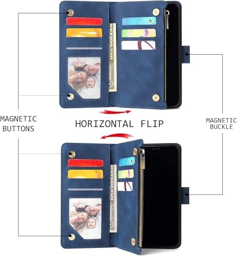 QLTYPRI Case for Samsung Galaxy A26 5G, Large Capacity Leather Wallet Case 6 Card Holder and 1 Zipper Pocket Kickstand Wrist Strap Magnetic Protective Cover for Samsung A26 – Blue