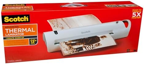 Scotch Advanced Thermal Laminator is ready to laminate is under a minute. It has an extra wide 13 in. input making it great for both small and big projects. Two heated rollers create high quality professional, bubble and wrinkle free results. The built-in carry handle stays cool and provides portability.