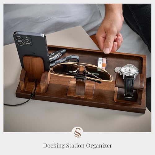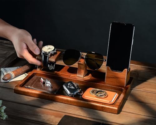 Stay organized in style with the Shanik Wooden Nightstand Organizer, a versatile docking station designed to simplify everyday carry storage. Handcrafted from Acacia wood, it provides durability with a natural finish that complements any bedroom, office, or entryway décor. Customers appreciate its strong build and premium feel. The multifunctional design includes a watch holder, phone stand, and a dedicated tray for glasses or other small essentials. Its layout is perfect for keeping wallets, keys, jewelry, and tech accessories in one tidy place. With the option for custom engraving, it transforms into a meaningful keepsake for any occasion. Cleaning is easy—simply wipe with a dry or slightly damp cloth, keeping the surface polished and fresh. While it doesn’t require assembly, the organizer is compact enough to fit neatly on nightstands, desks, or dressers without taking up extra space. Not just functional, this wood docking station is a popular gift choice. Customers consistently highlight its elegant look and usefulness, often noting how it becomes a daily essential. Whether purchased as a gift for men or women or used personally, the Shanik Nightstand Organizer is the perfect blend of practicality and design.