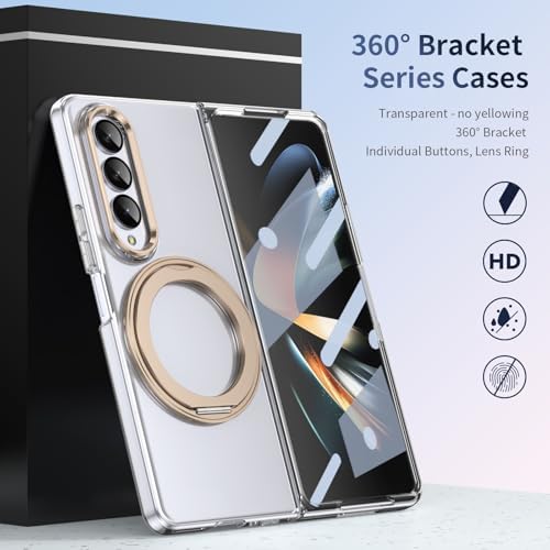 Smartphone Flip Cases Compatible with Samsung Galaxy Z Fold 3 Case with Screen Protector, 360°Rotatable Ring Kickstand, Military Grade Shockproof Translucent Protective Case, Crystal Clear(Golden)