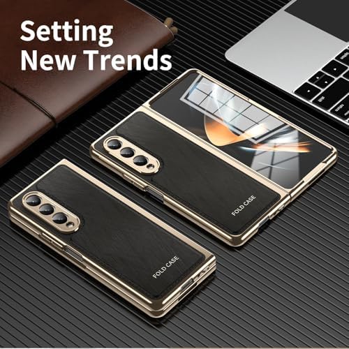Smartphone Flip Cases Folding Case Compatible with Samsung Galaxy Z Fold 3 with Screen Protector, Luxury PU Leather Slim Fit Phone Cover – Plating Gold Edge, Drop, Scratch & Shock Protection Case(Blac