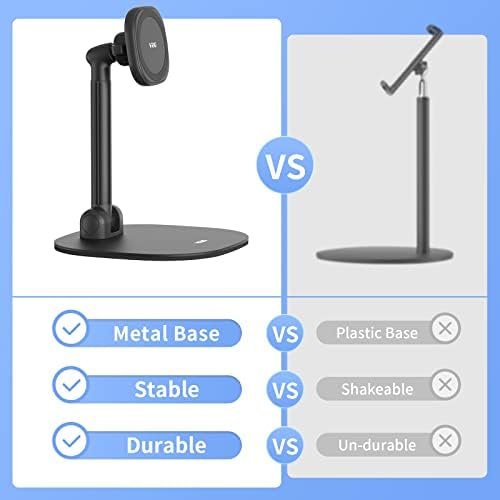 ?High Stability & Adjustable Height?The magnetic desk phone stand has an adjustable height in the range of 170mm – 300mm (6.7 – 11.8 inches). Together with its adjustable tilt, it provides you with the most comfortable viewing angles and ergonomic eye-level height. It provides you with the best visual experience, while maintaining your hands free.With bigger and more stable base. And the magnet has strong suction, so it won’t shake when you click.