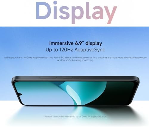 [Immersive 6.9″ display] With support for up to 120Hz adaptive refresh rate, Redmi 15C adjusts to different scenarios for a smoother and more responsive visual experience—whether you’re browsing or watching