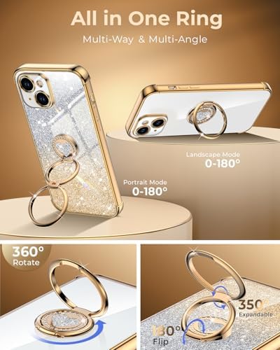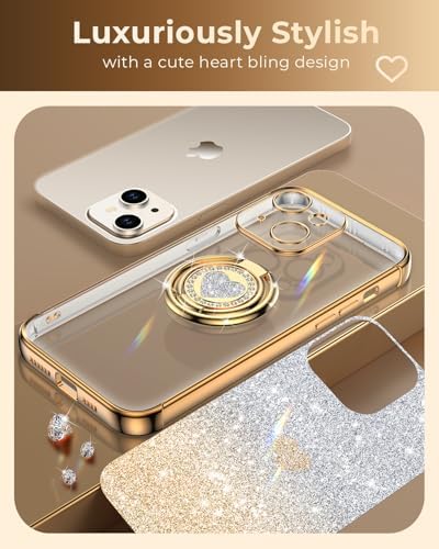 XYZ for iPhone 13 Mini Case with Stand, Phone Case with Double Ring Kickstand, Women Girls Bling Luxury Glitter Clear Phone Case Cover Heart for iPhone 13 Mini, Gold